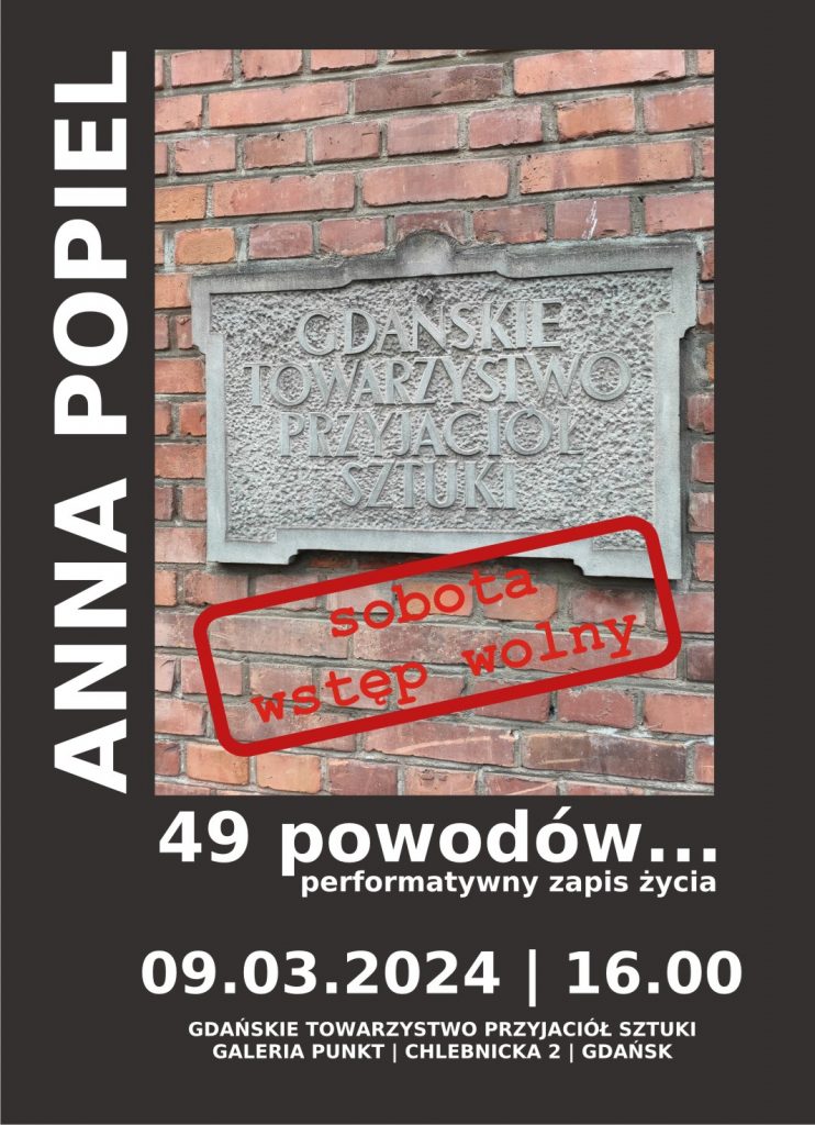 Wystawa prac Anny Popiel pt. „49 powodów – performatywny zapis życia”. Wernisaż otwiera pokaz multimedialny (godz. 16.15), organizator prosi o punktualne przybycie.